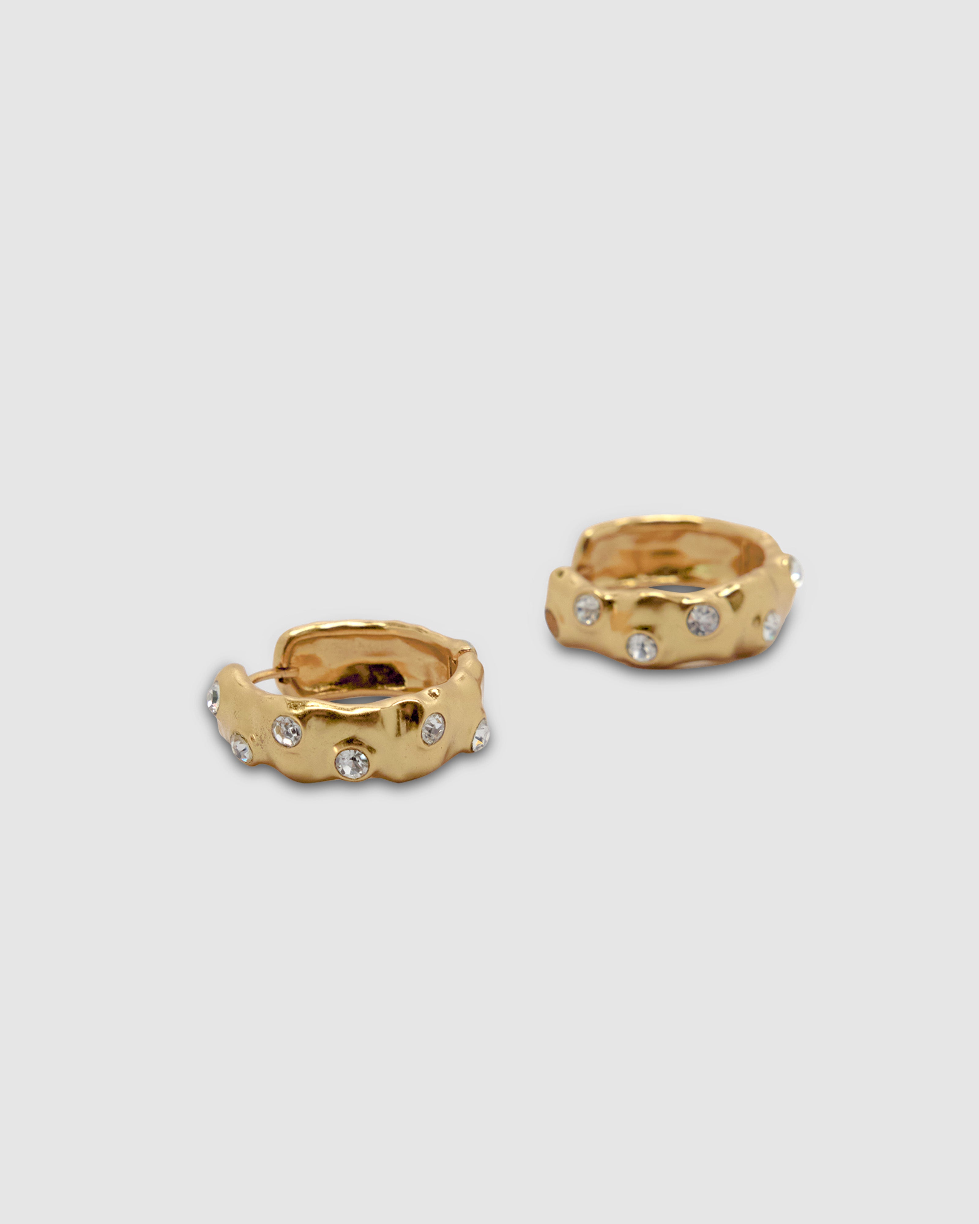 A refined nod to the polka-dot, these organic hoop earrings are crafted from a solid brass base and finished in 24k gold plating. Intentionally placed white cubic zirconia stones resembling delicate dots of light, creating a soft sparkle that moves effortlessly with you. Sculptural and timeless, they’re designed for everyday wear and lasting appeal.