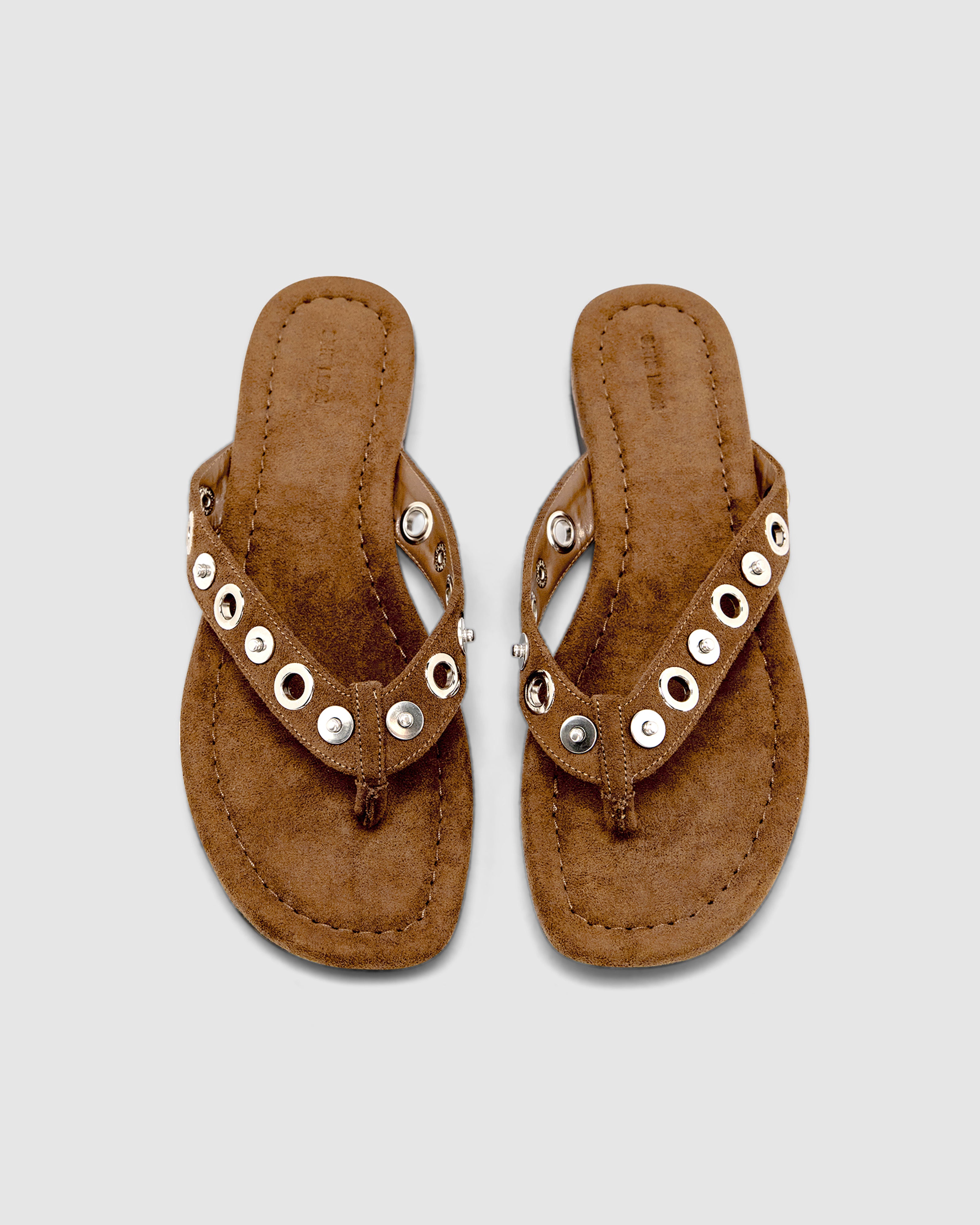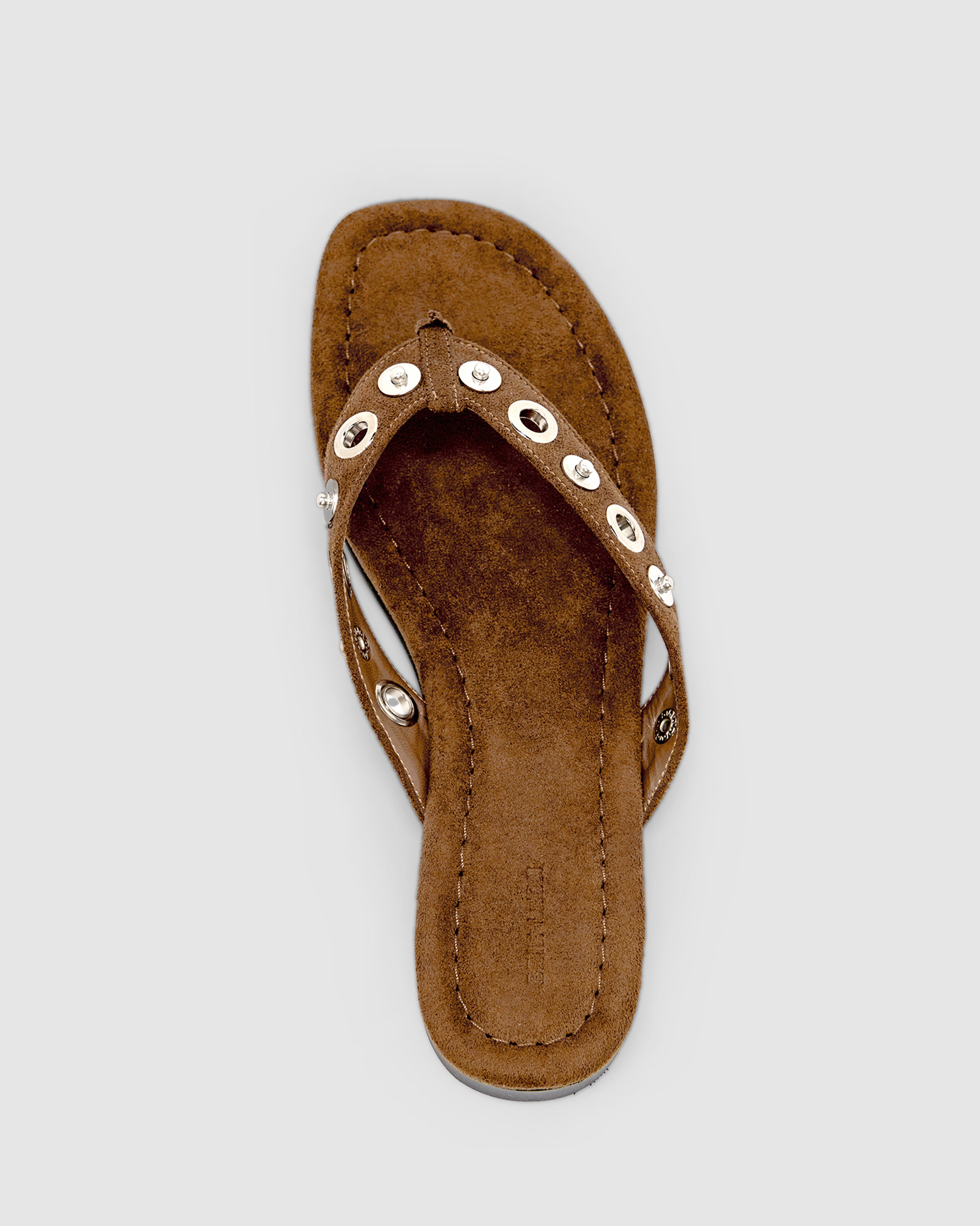 A modern twist on an everyday essential. The Eyelet Sandals feature a sleek thong silhouette with eye-catching metal eyelet detailing across the straps. Crafted from 100% recycled polyester and recycled smooth PU lining. It offers a luxuriously soft, suede-like finish while remaining durable enough for everyday use. These sandals pair effortless comfort with contemporary edge.