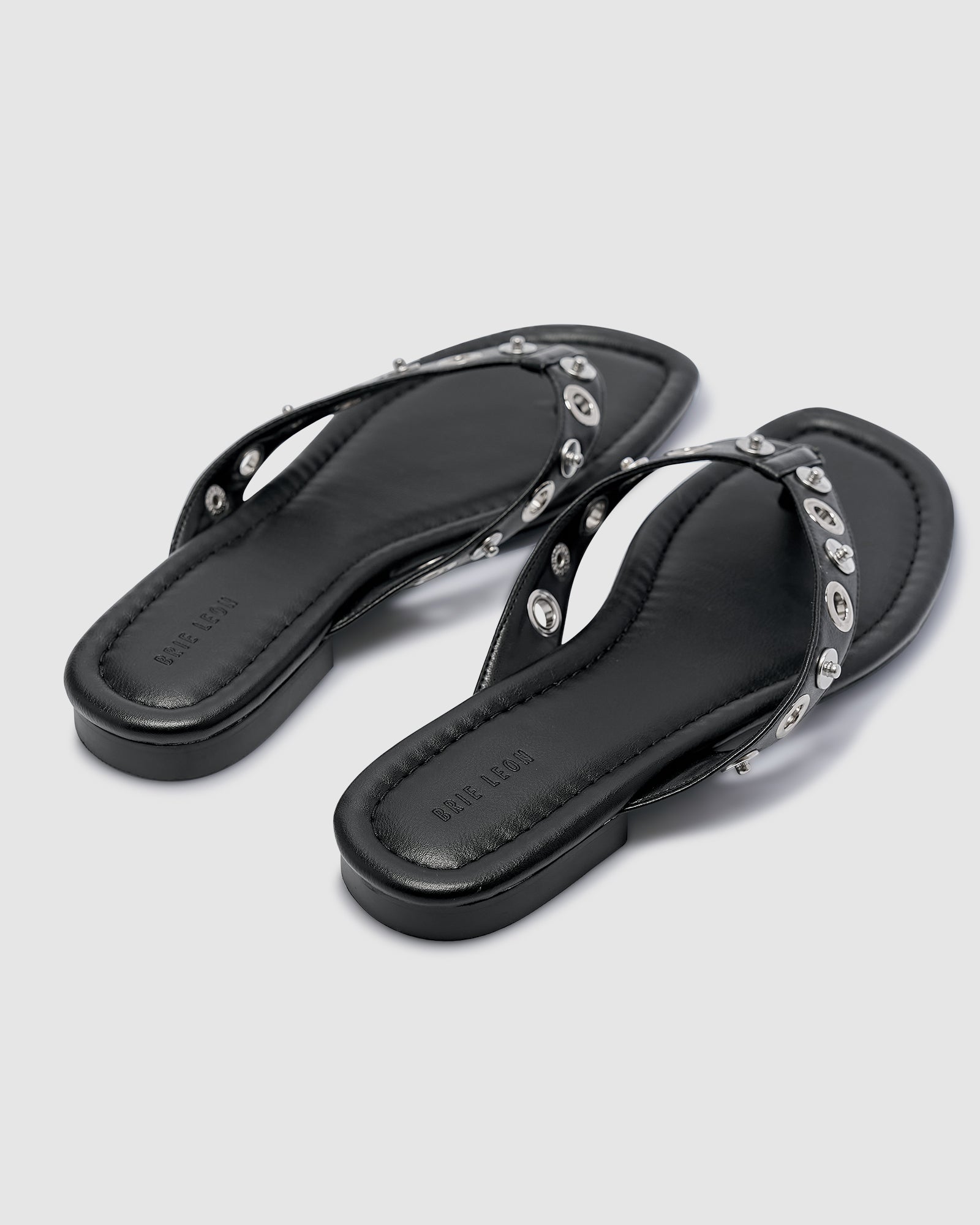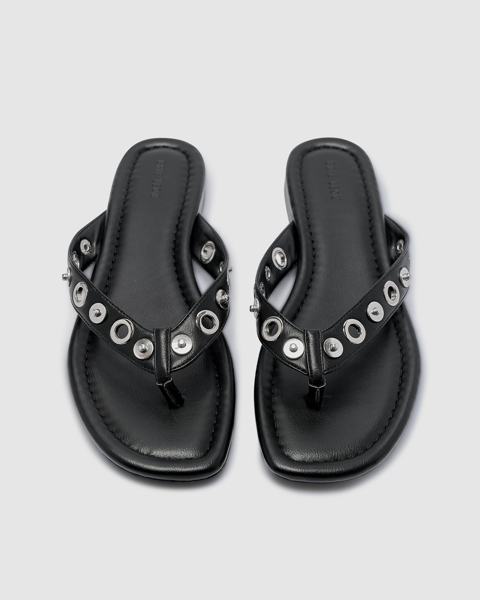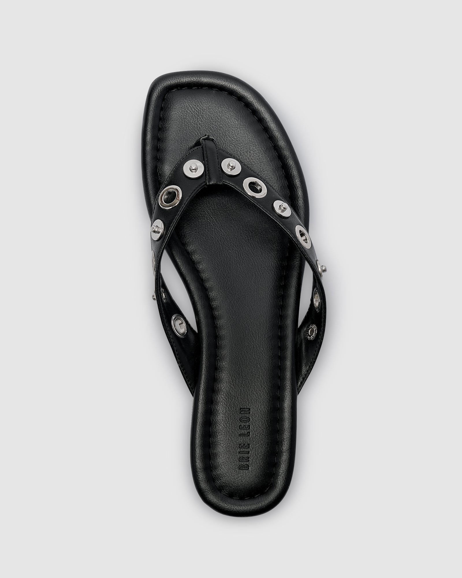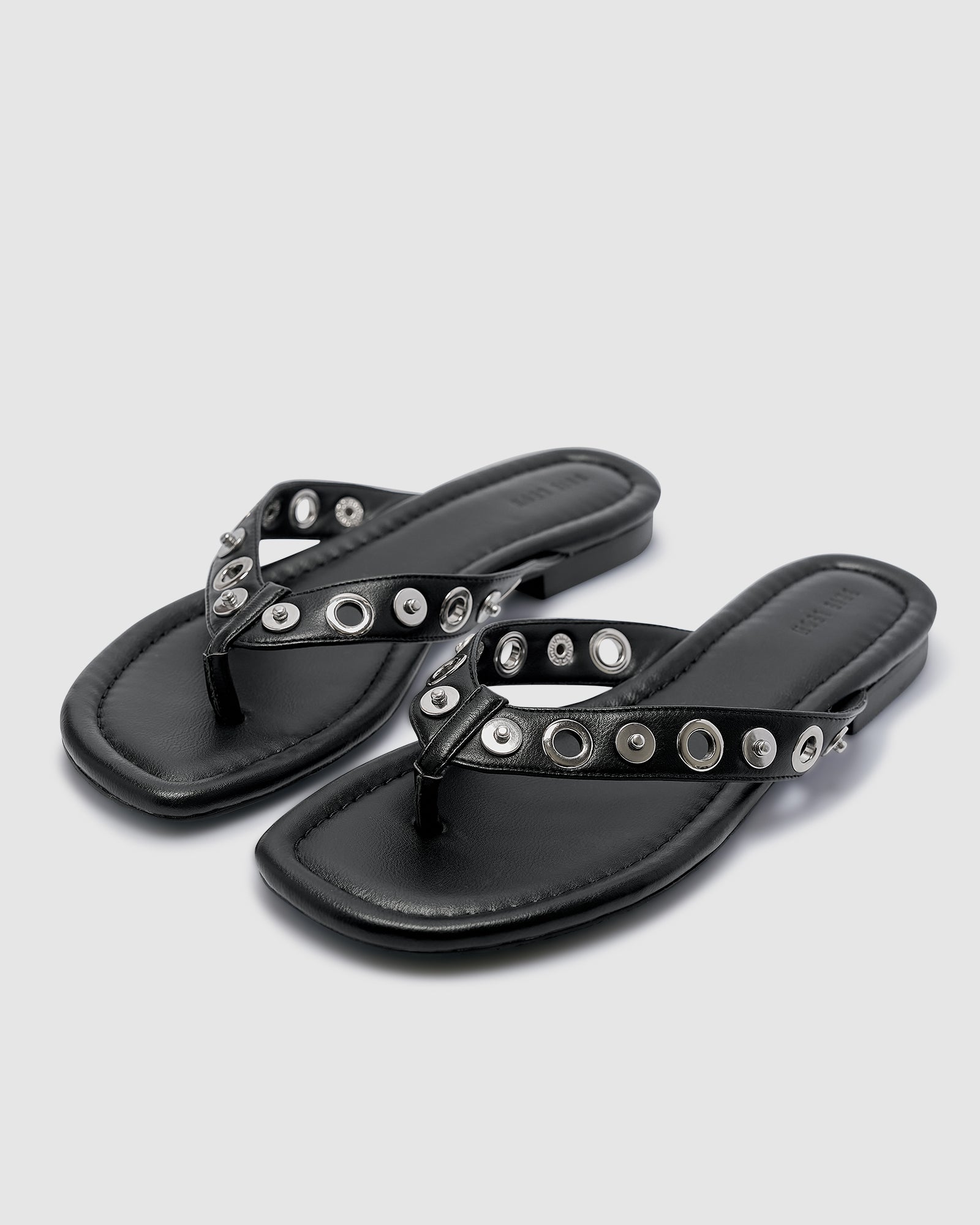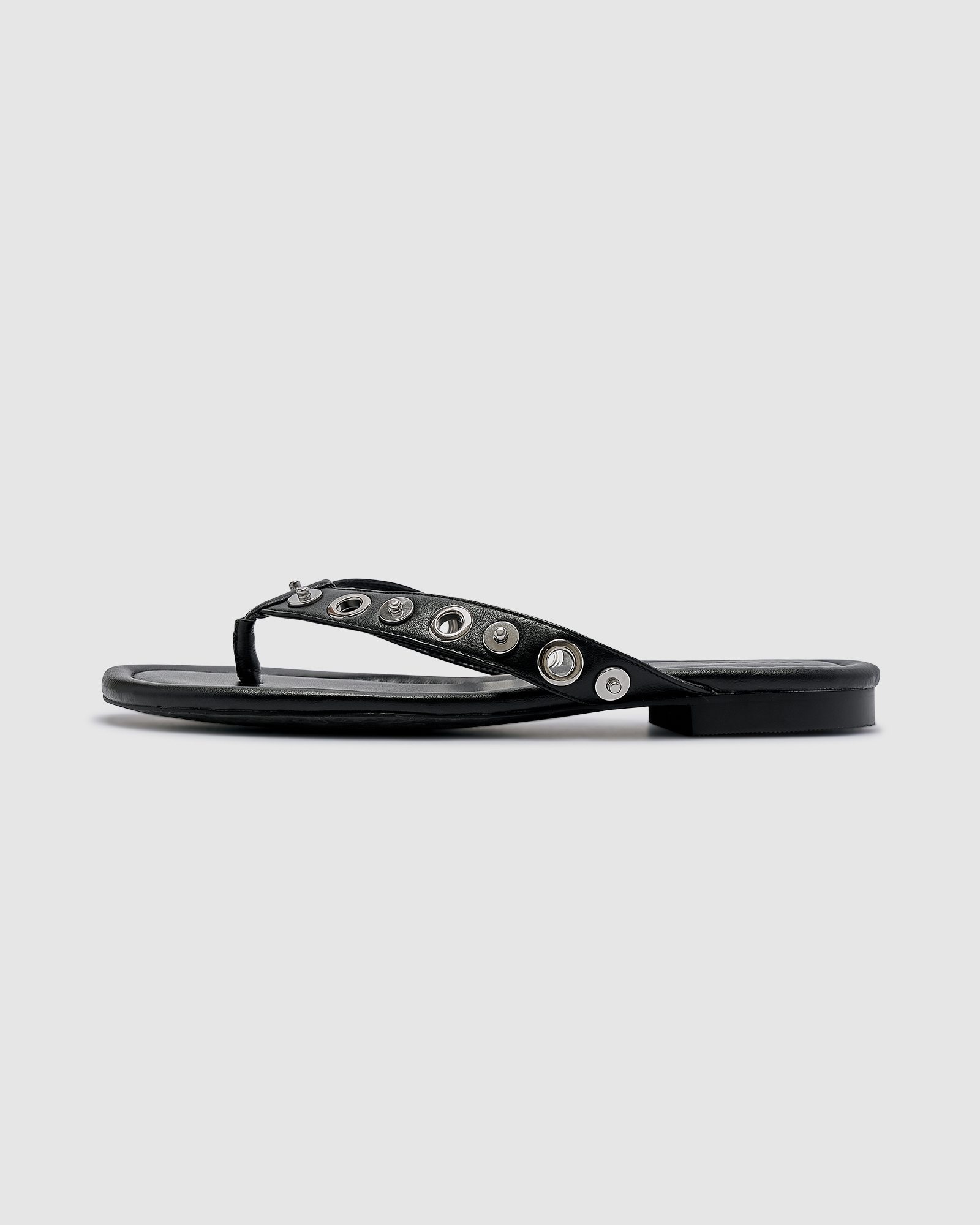 A modern twist on an everyday essential. The Eyelet Sandals feature a sleek thong silhouette with eye-catching metal eyelet detailing across the straps. Designed in a shiny silver finish with a recycled smooth PU upper and lining, these sandals pair effortless comfort with contemporary edge.