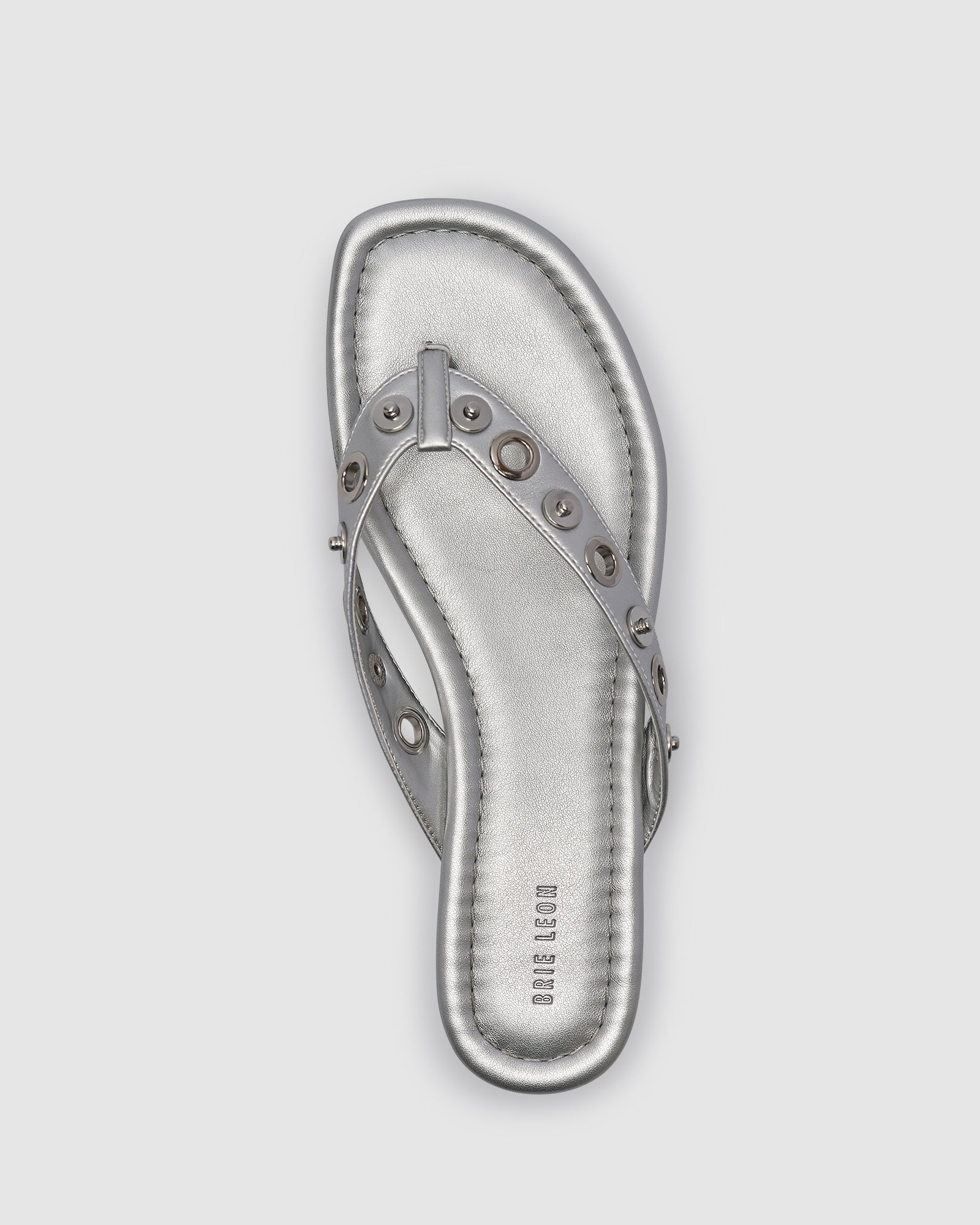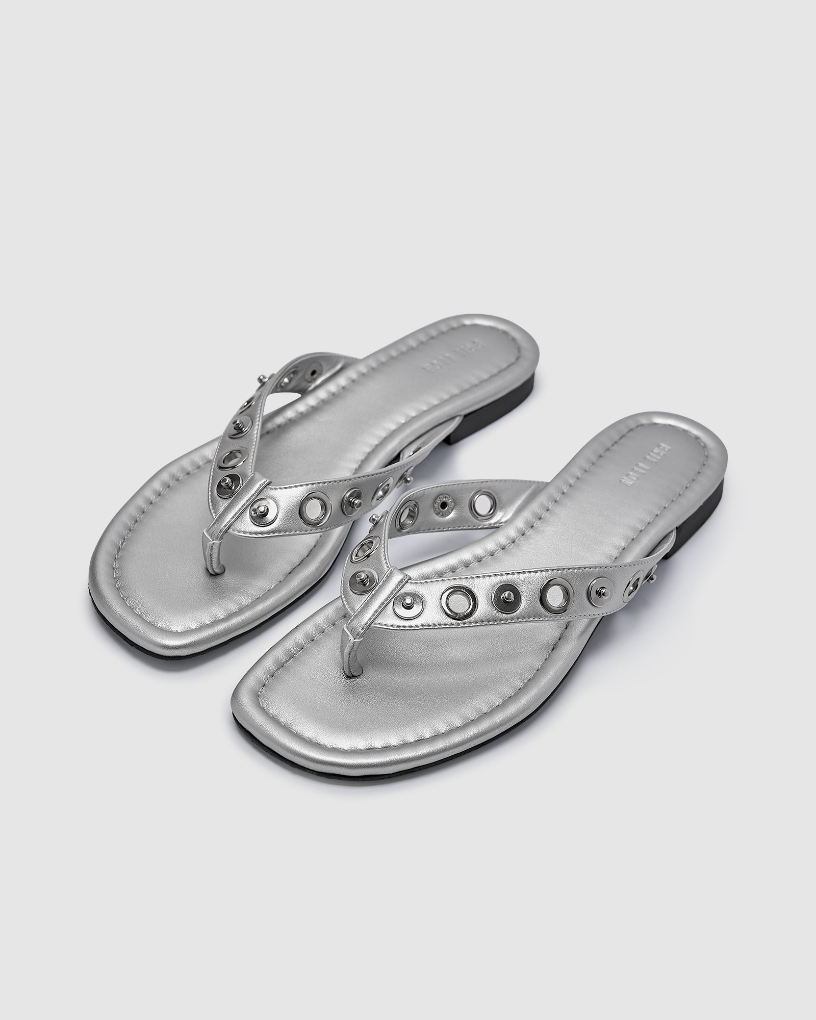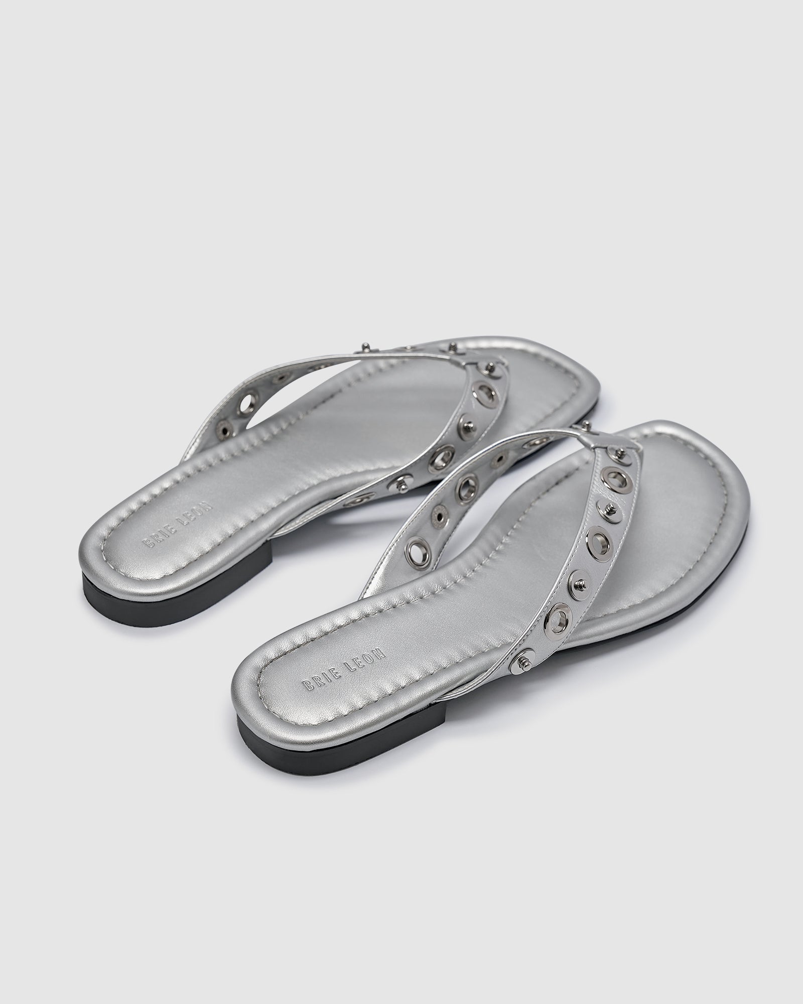 A modern twist on an everyday essential. The Eyelet Sandals feature a sleek thong silhouette with eye-catching metal eyelet detailing across the straps. Designed in a shiny silver finish with a recycled smooth PU upper and lining, these sandals pair effortless comfort with contemporary edge.