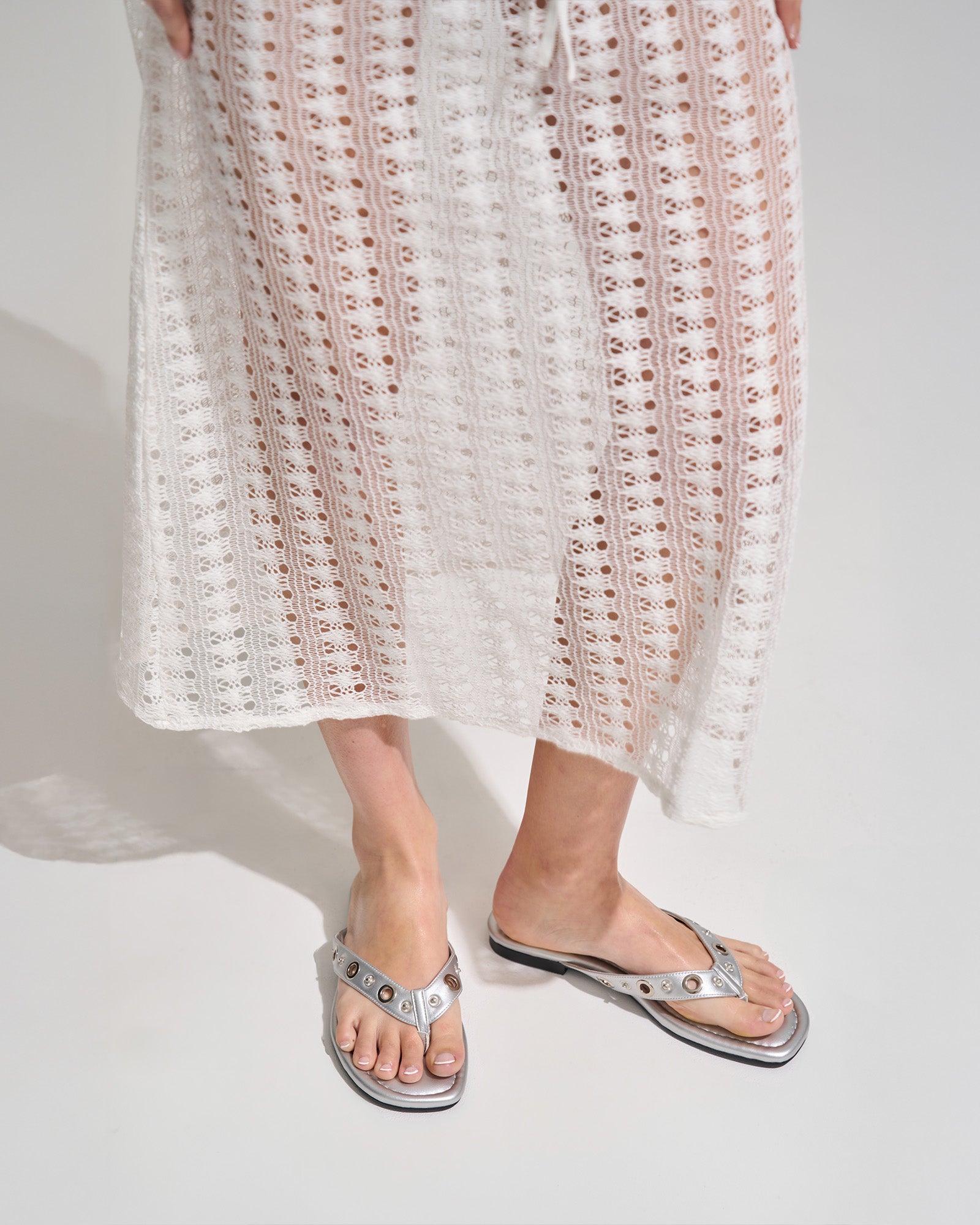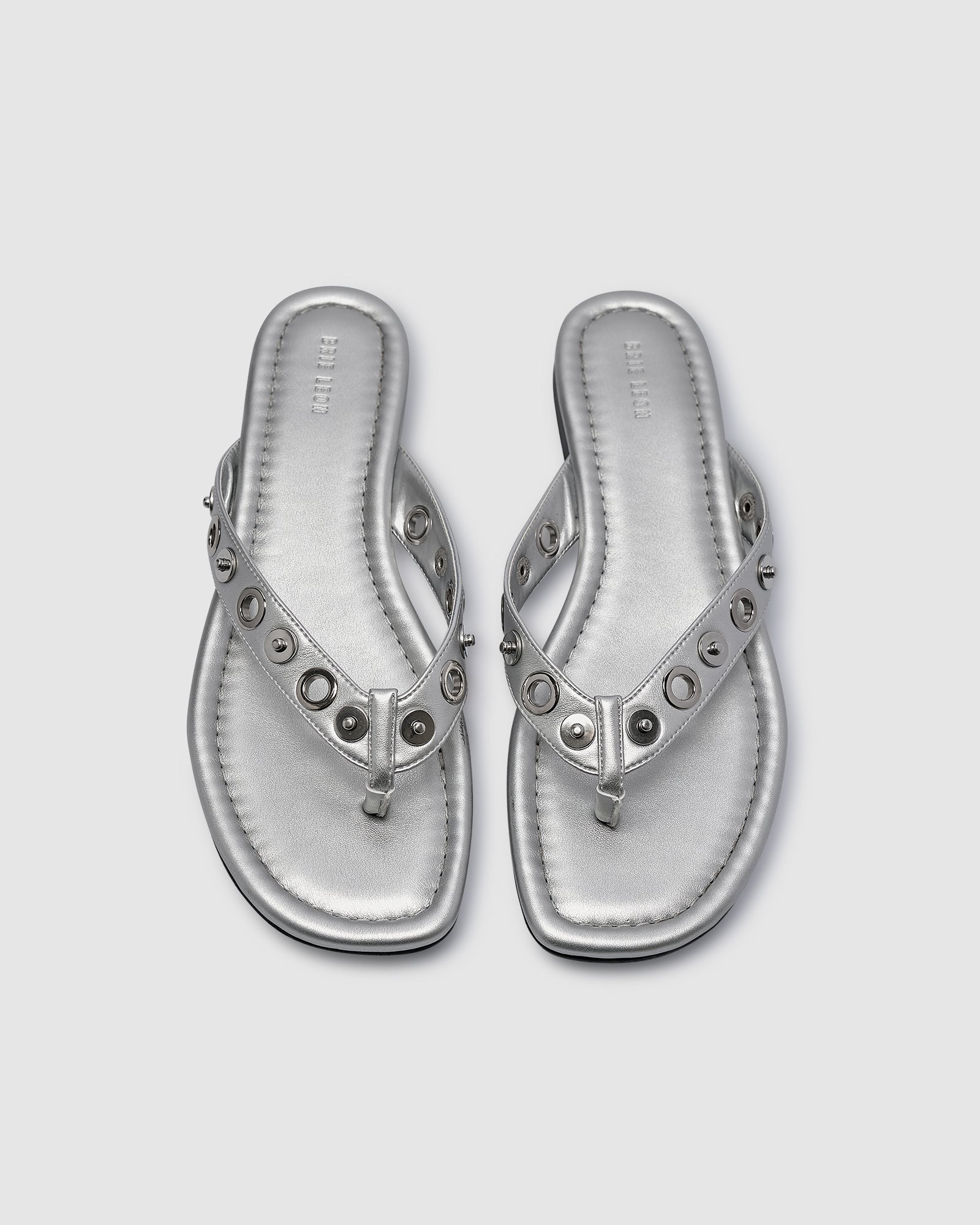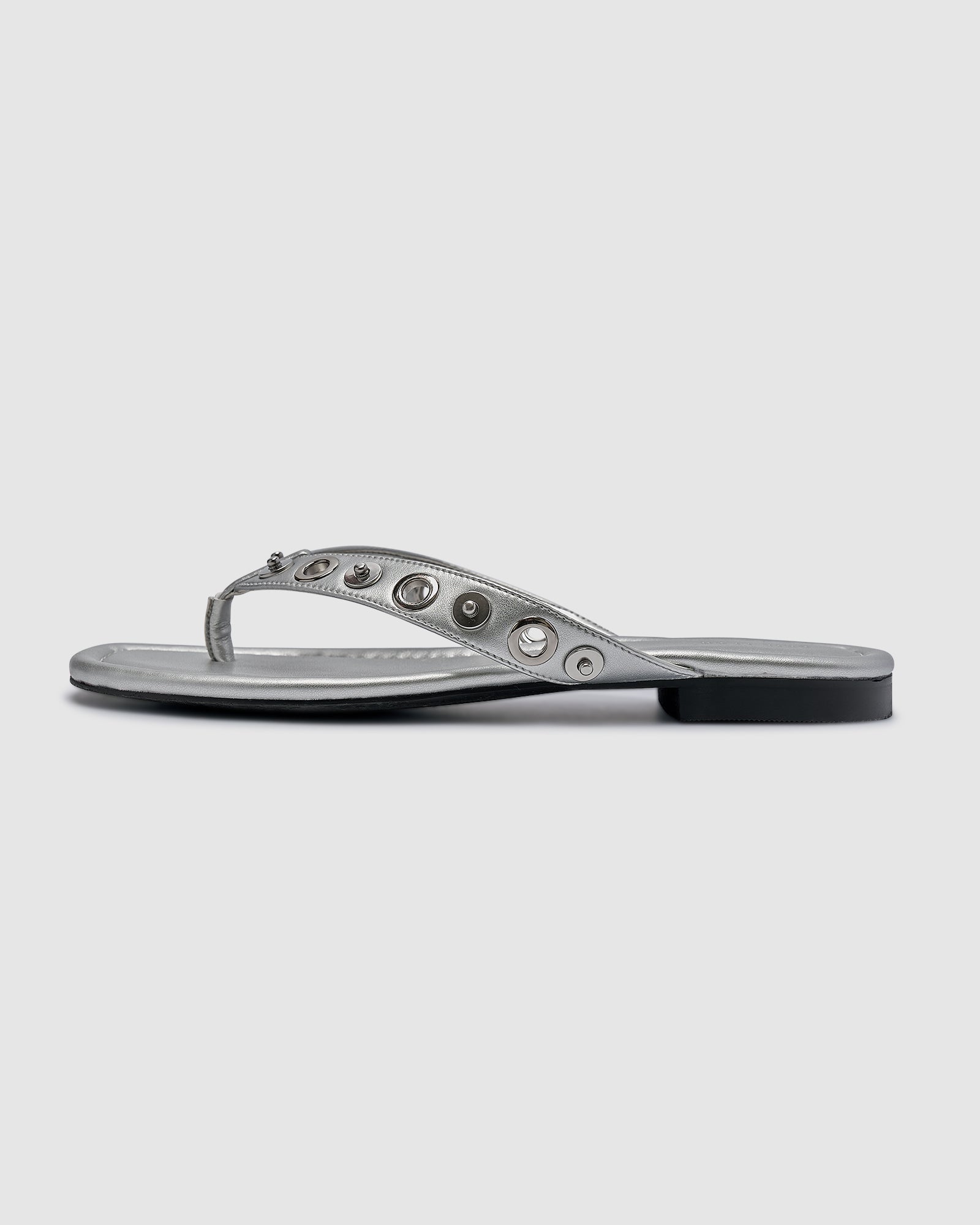 A modern twist on an everyday essential. The Eyelet Sandals feature a sleek thong silhouette with eye-catching metal eyelet detailing across the straps. Designed in a shiny silver finish with a recycled smooth PU upper and lining, these sandals pair effortless comfort with contemporary edge.