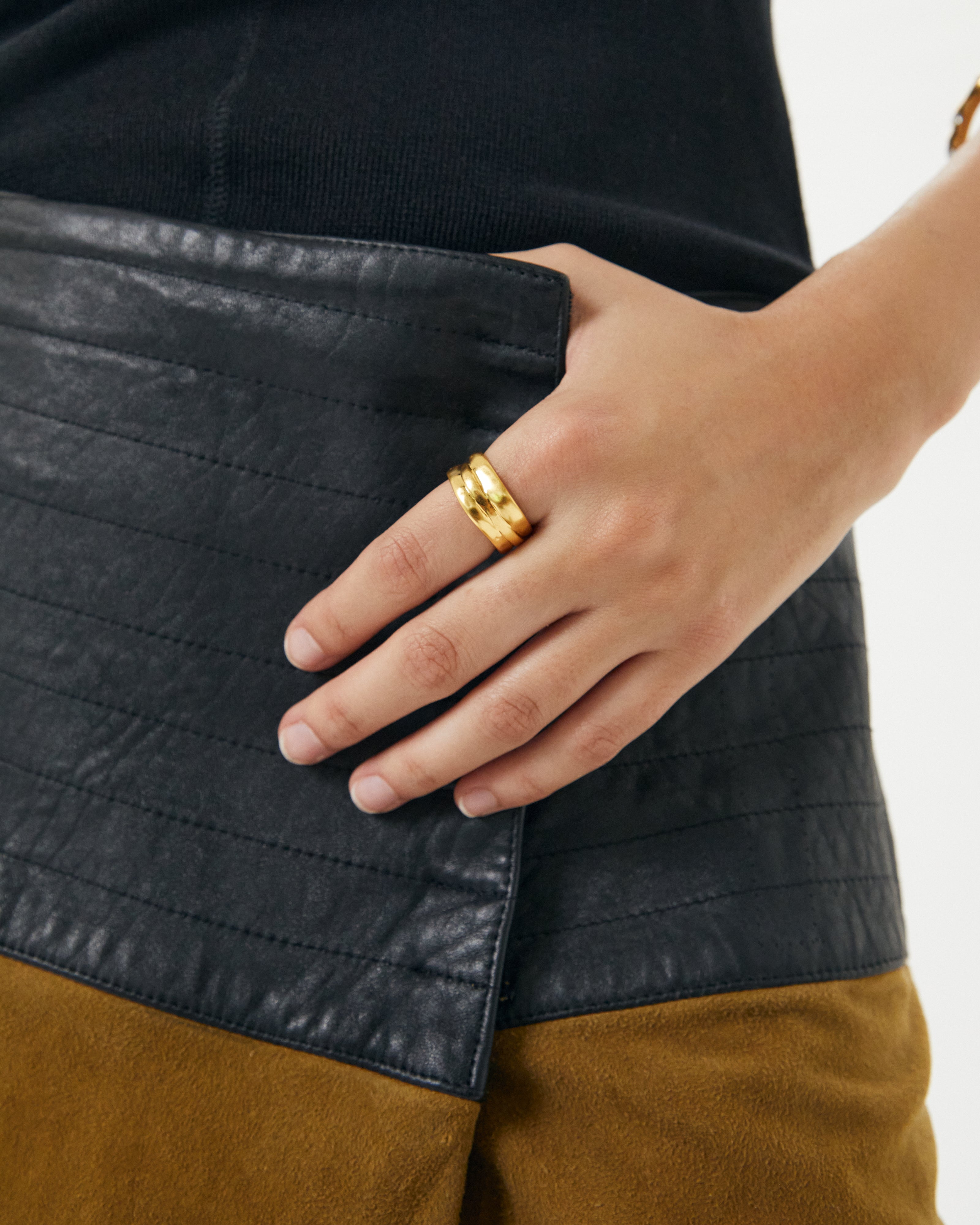 A sculptural statement with a warm golden glow, the Sloane Ring features soft curves and a brushed finish for a refined yet organic feel. Its wide band design makes it an effortless everyday piece or a striking addition when stacked with finer rings.